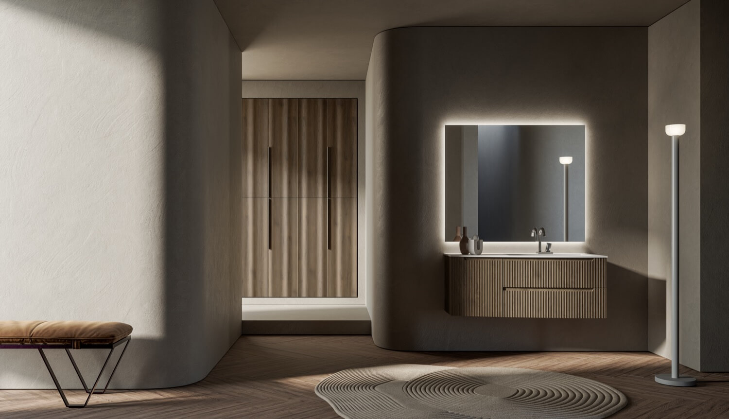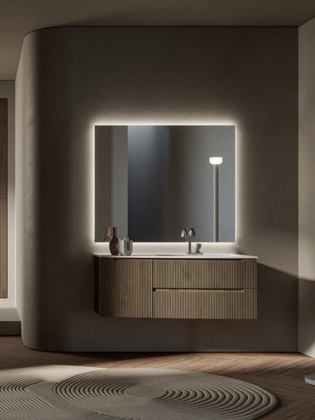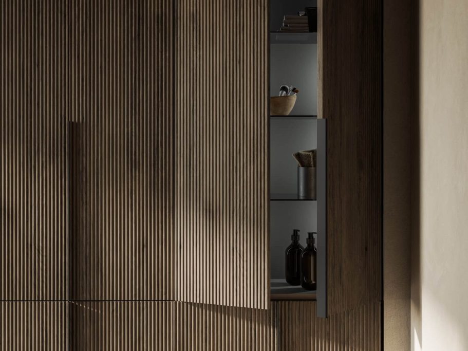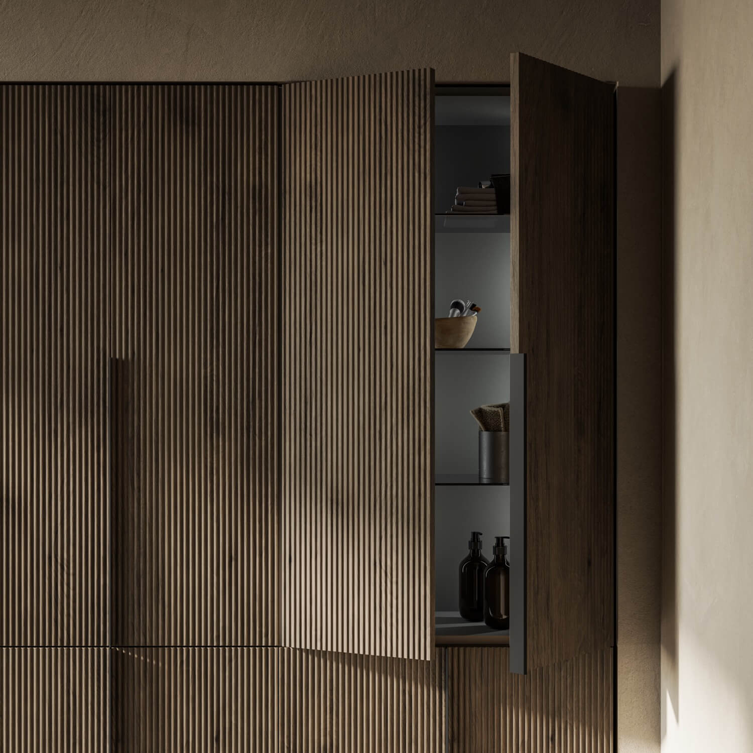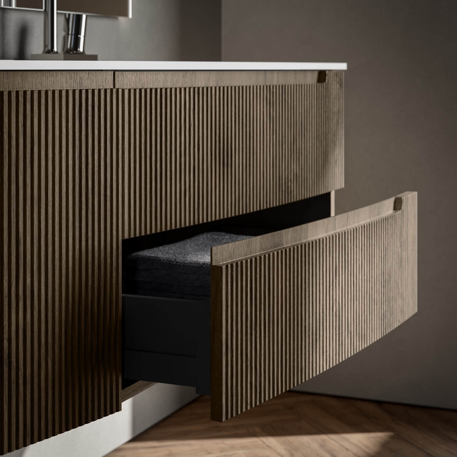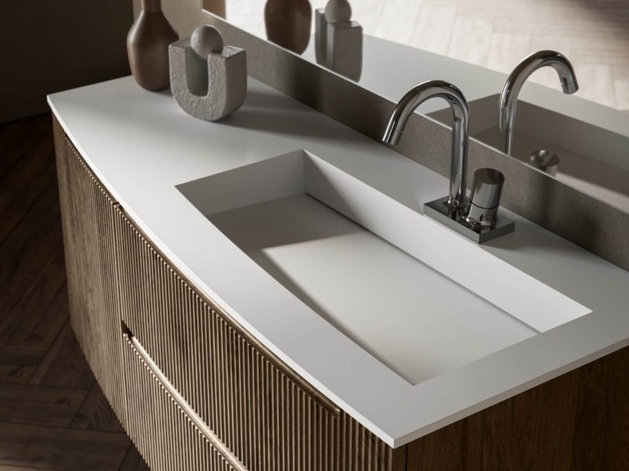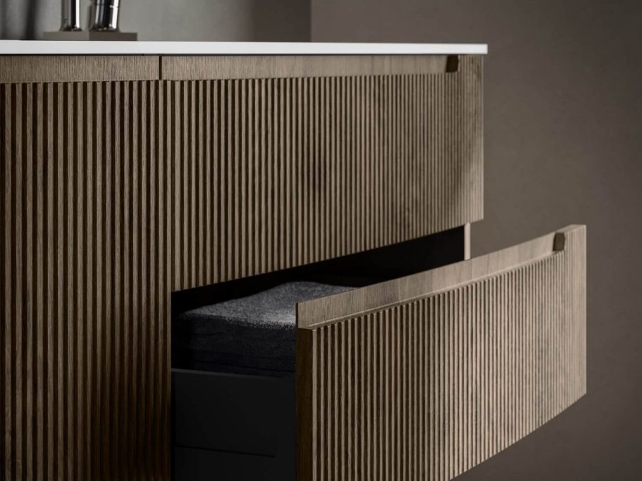 Die sorgfältig ausgearbeiteten Details betonen diese weiche, elegante Form, die das Modell unverwechselbar macht. Ergänzend verfügt die Ocritech-Arbeitsplatte über eine speziell integrierte Wanne, die perfekt auf diese Lösung abgestimmt ist. Darüber hinaus lässt sich Vertigo Evolution mühelos mit dem umfangreichen Sortiment an Aufbewahrungselementen der Originalversion mit Griff kombinieren und eröffnet so vielfältige, ansprechende Gestaltungsmöglichkeiten.