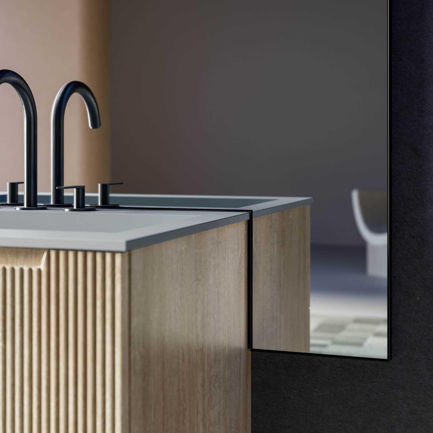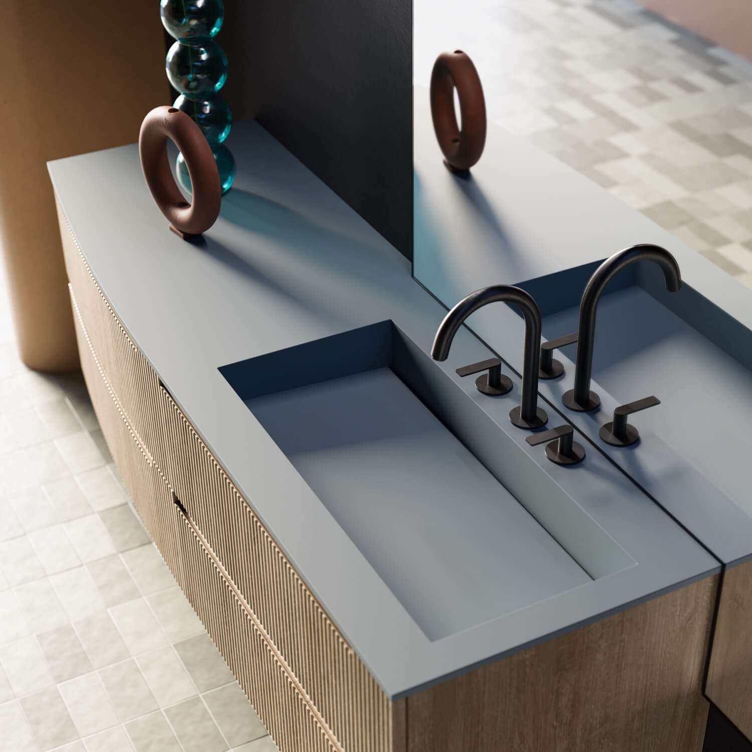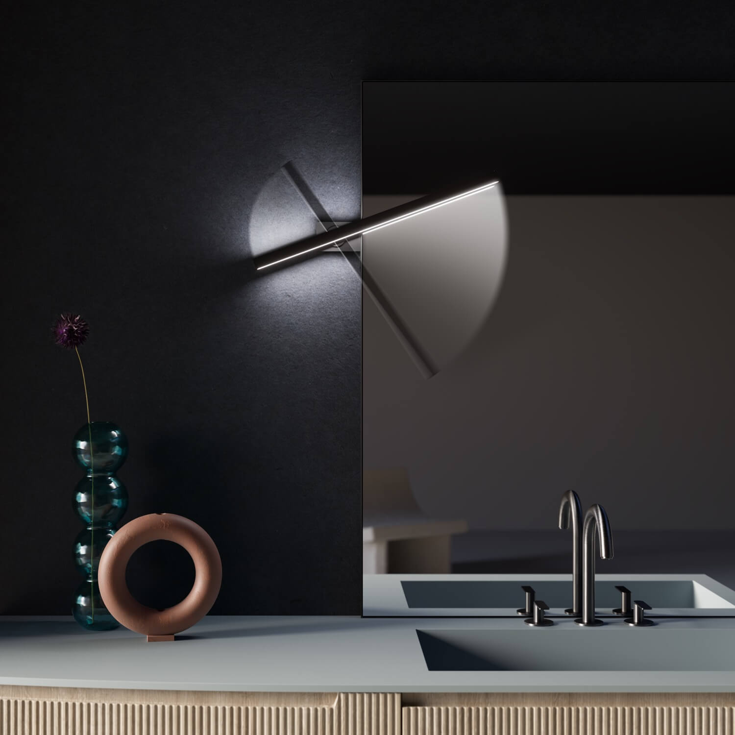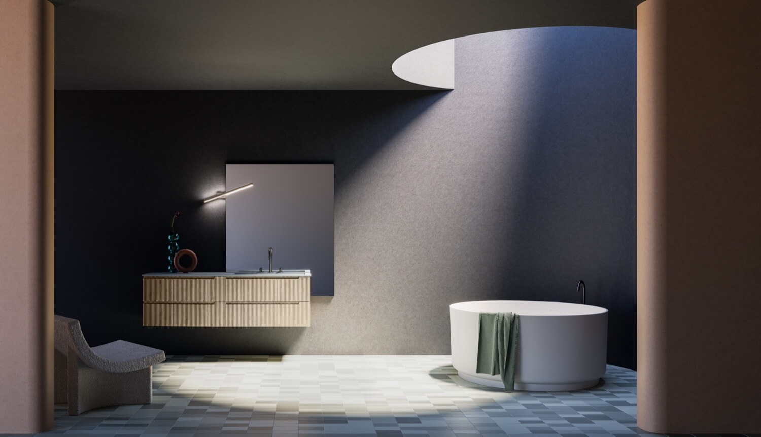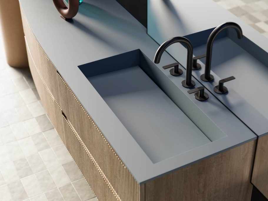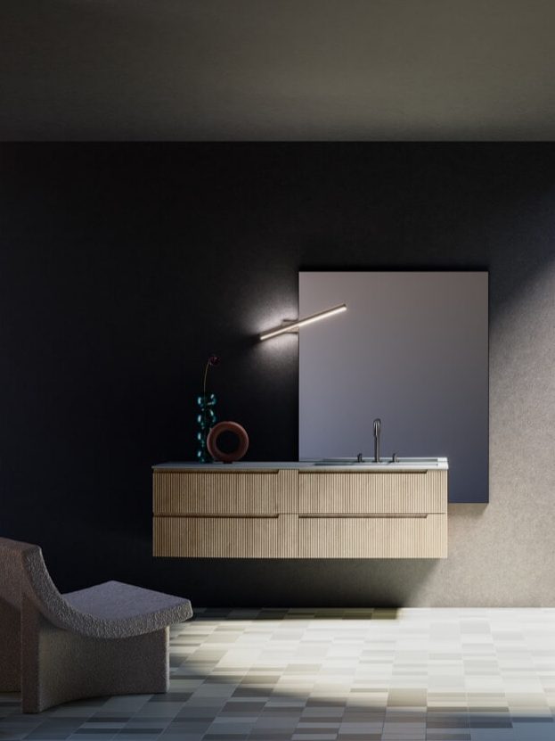 Ein Entwurf, der die beiden Seelen dieses neuen Modells vereint: Der geschwungene Sockel auf der linken Seite bildet die natürliche Ergänzung zur geradlinigen Waschbeckeneinheit.