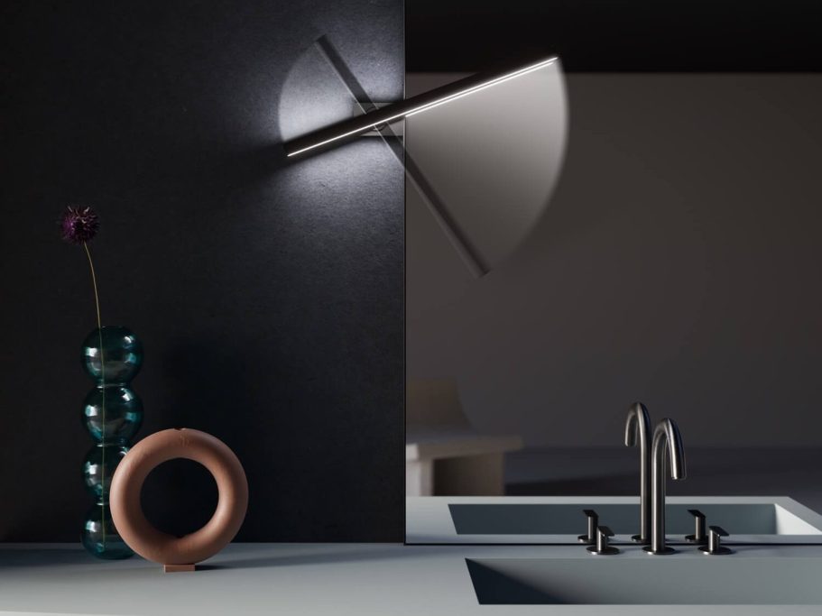 Die Variante MERIDIAN 2 der Lampe eröffnet zusätzliche Flexibilität, da sie sowohl am oberen als auch am seitlichen Profil des Spiegels montiert werden kann.