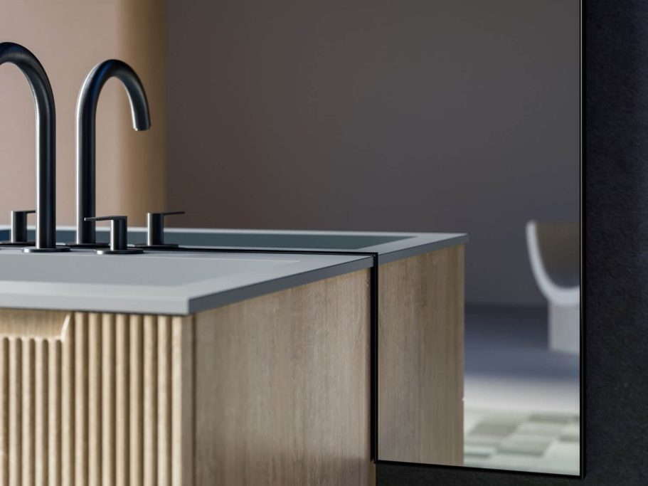 Unter den zahlreichen Gestaltungsmöglichkeiten unseres Katalogs findet sich auch die Option, einen Spiegel passgenau zuzuschneiden, sodass er sich harmonisch in andere Elemente einfügt.