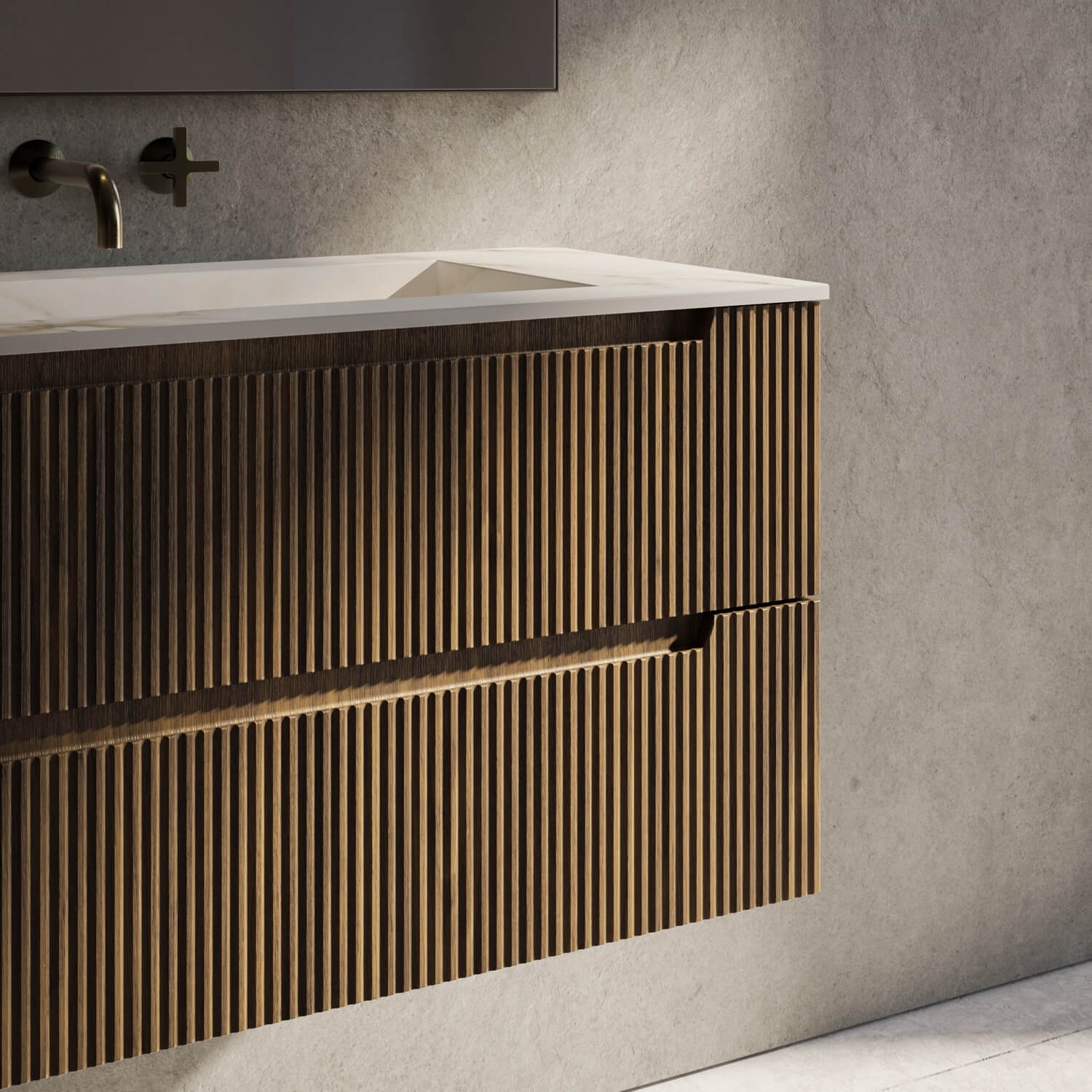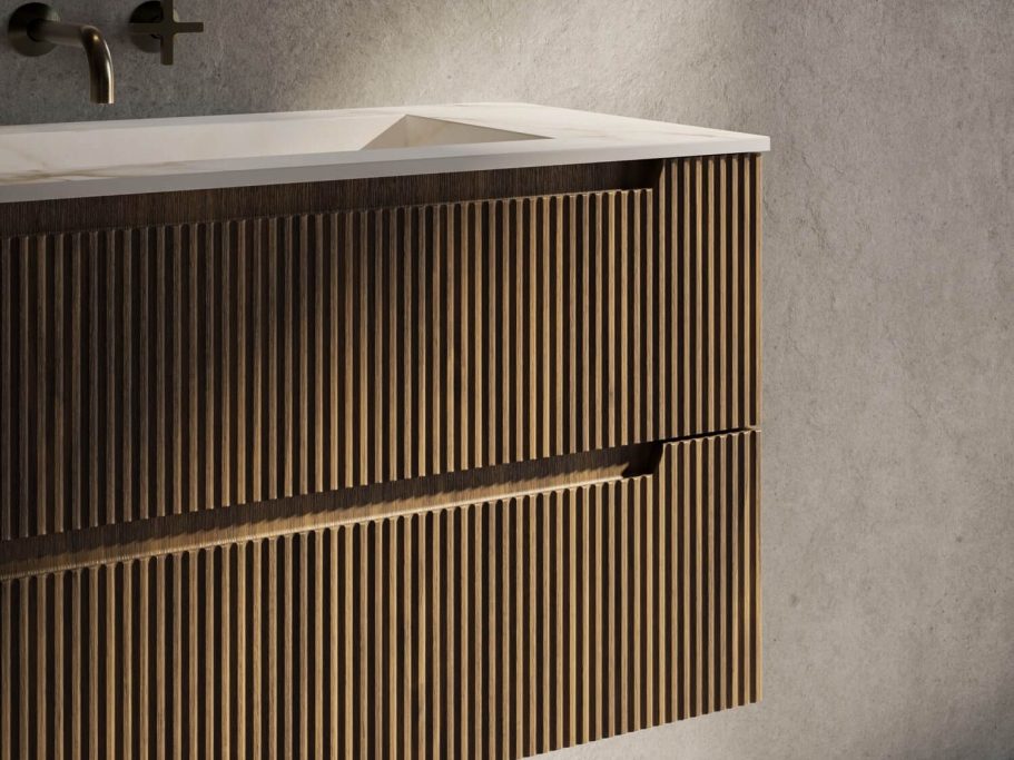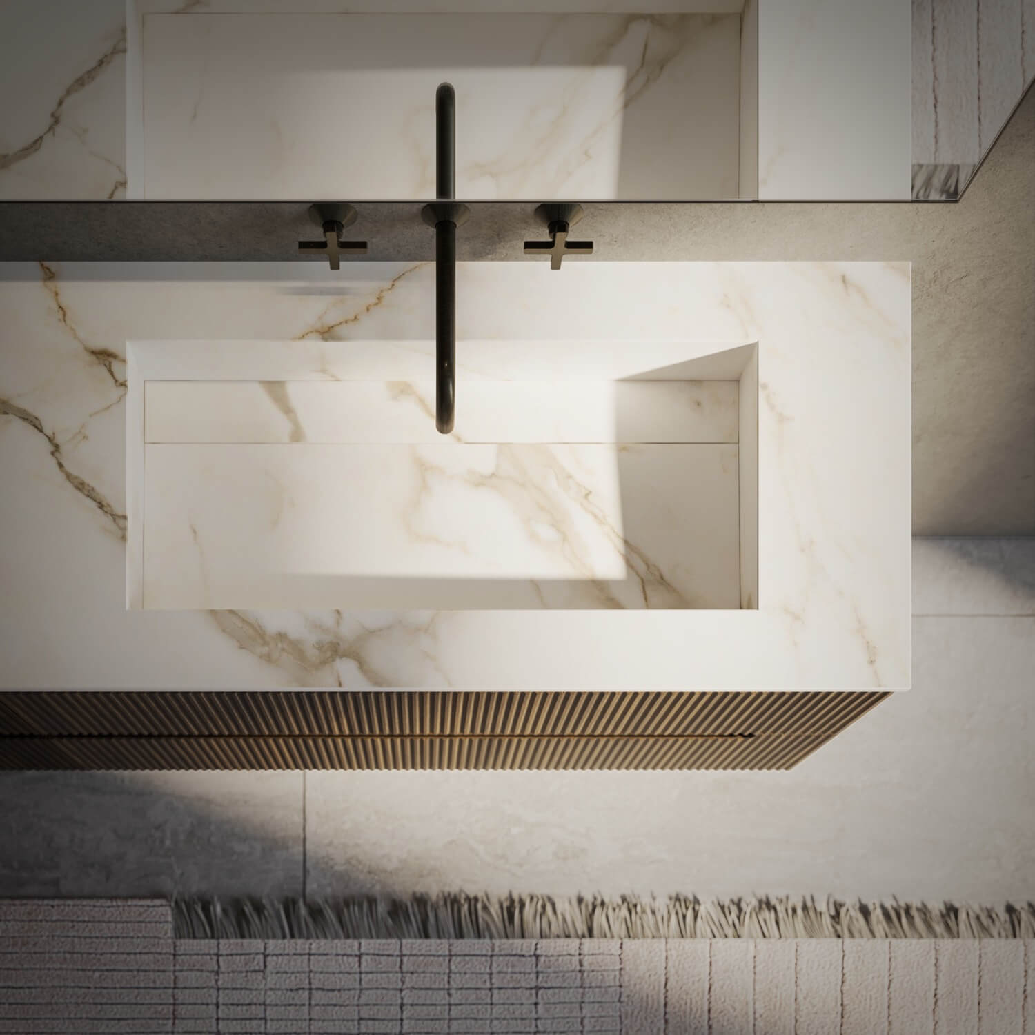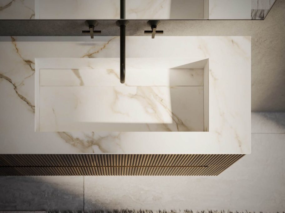 Puntotre arbeitet bei der Lieferung von Feinsteinzeugplatten für seine Arbeitsplatten mit den wichtigsten und innovativsten Marken zusammen. Aufgrund der Plattenstärke kann die Verfügbarkeit je nach Markt variieren; daher können die Platten durchgefärbte Keramikkanten oder eine unregelmäßige Oberflächenbearbeitung aufweisen.