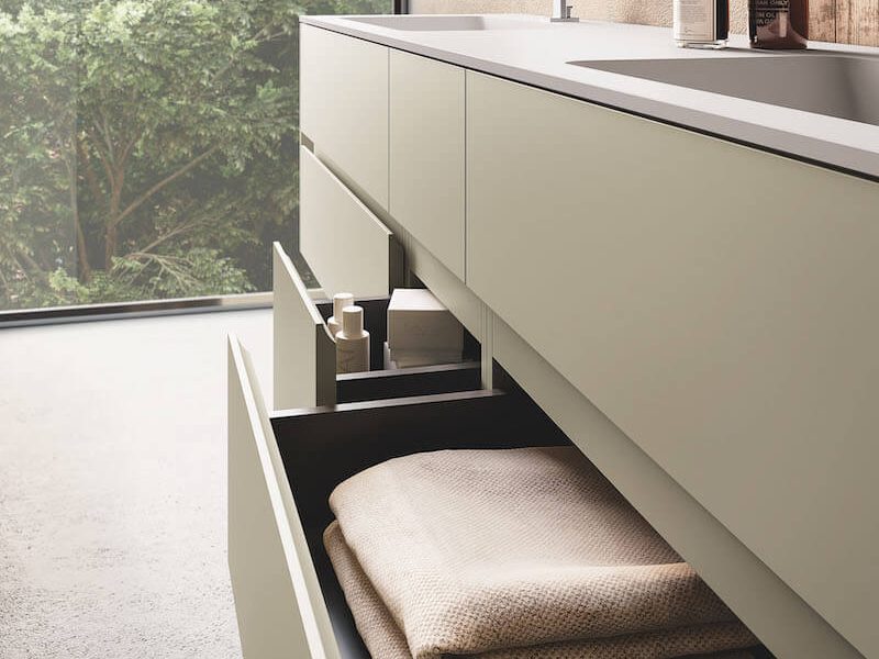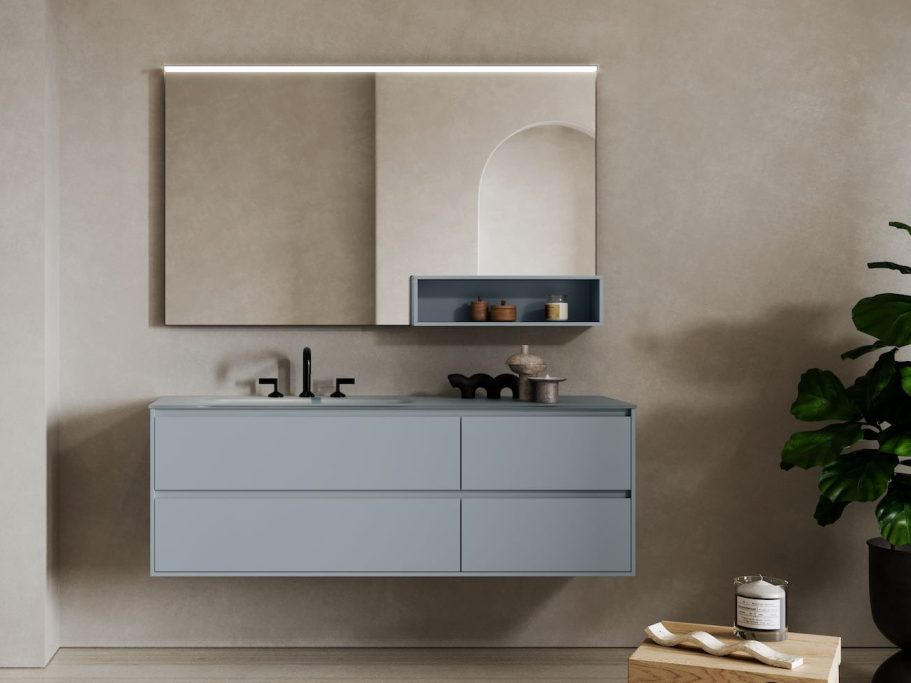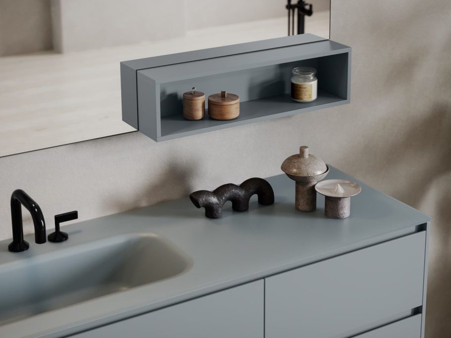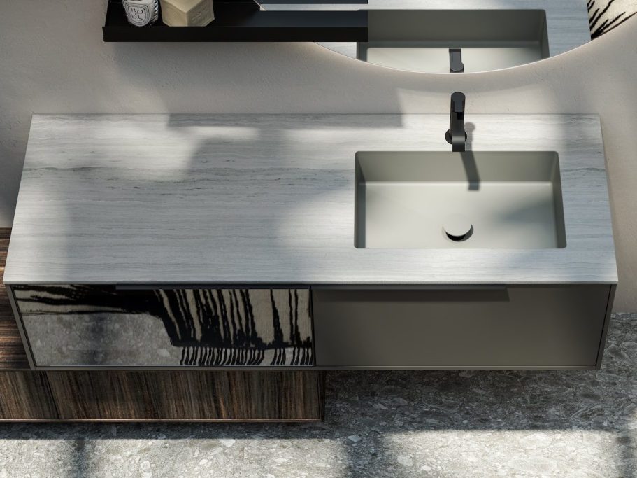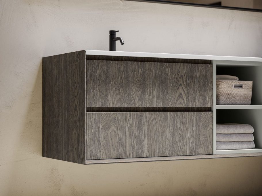 Nutzen Sie den verfügbaren Platz im Badezimmer mit unseren modularen Systemen. Es gibt unzählige Lösungen, mit denen Sie Ihrer Kreativität Ausdruck verleihen können. Der hier gezeigte CINQUE Waschtisch ist in verschiedenen Farben erhältlich.