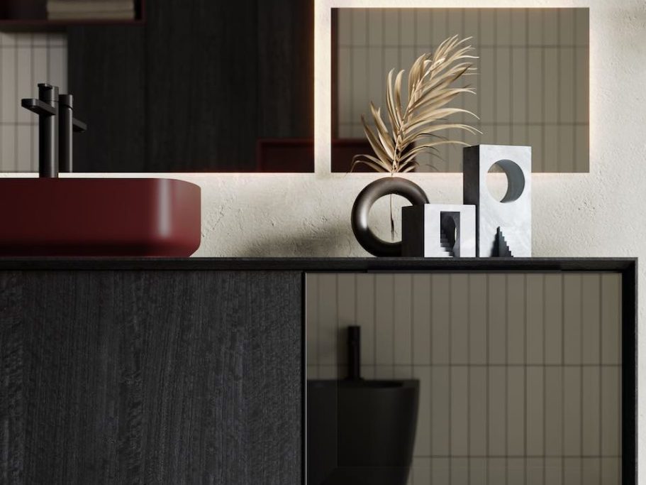 Das COGNAC-Waschbecken aus mattschwarzer Keramik ist ein interessantes Detail für diese Komposition und die ideale Ergänzung zur neuen HPL-Platte in der Ausführung JAZZ PLUS, mit einem Anti-Fingerabdruck-Effekt, der auch die Wartung erleichtert.