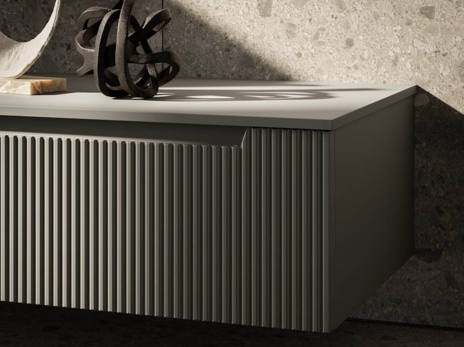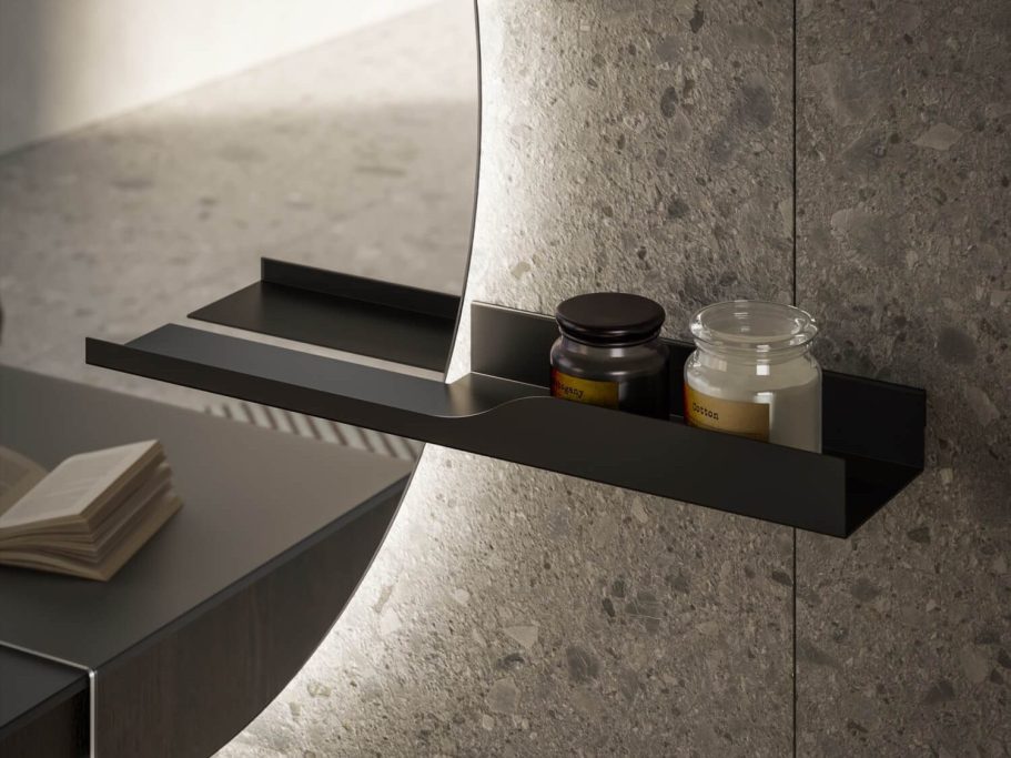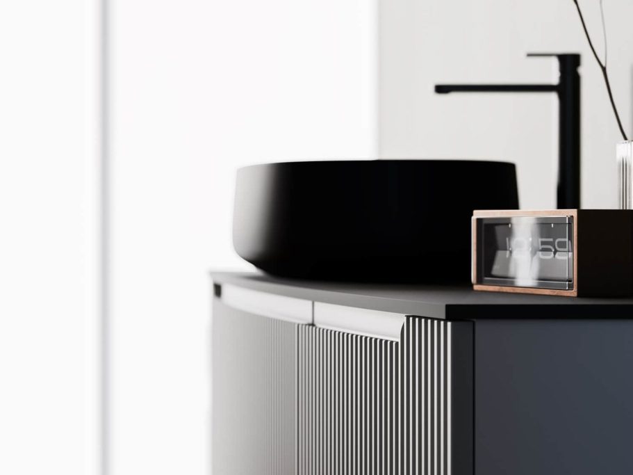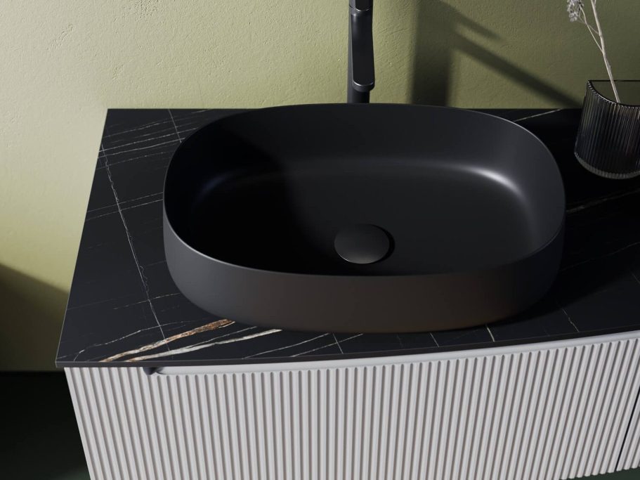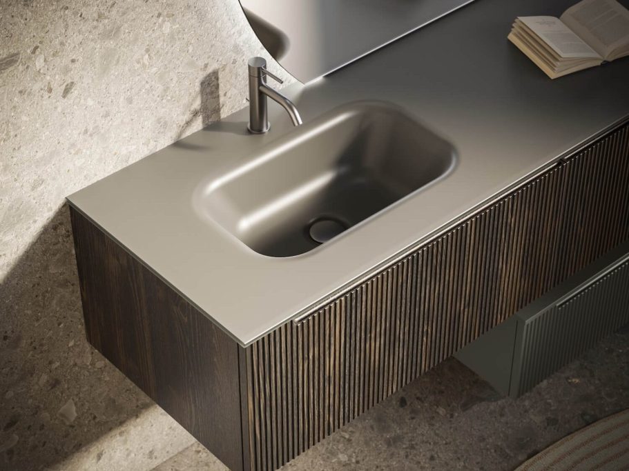 Das COGNAC-Waschbecken aus mattschwarzer Keramik ist ein interessantes Detail für diese Komposition und die ideale Ergänzung zur neuen HPL-Platte in der Ausführung JAZZ PLUS, mit einem Anti-Fingerabdruck-Effekt, der auch die Wartung erleichtert.