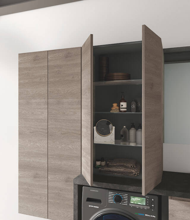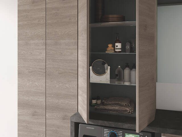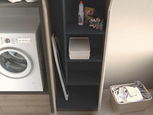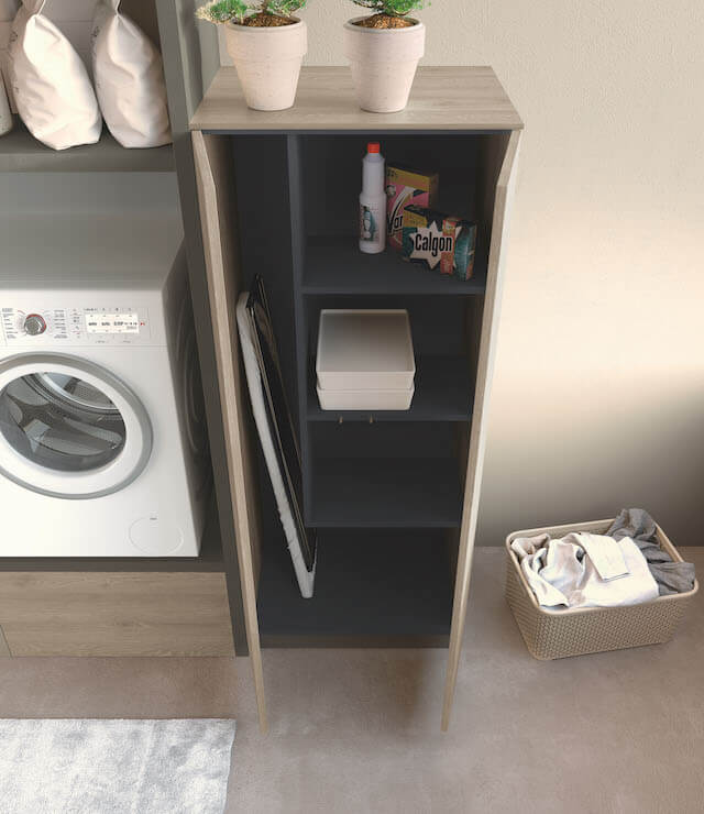 Eine echte Komplettlösung: Das Fach im Inneren der Säule bietet Platz für entweder ein Bügelbrett oder ein komplettes Set aus Besen und Bürsten sowie die notwendigen Reinigungsmittel.