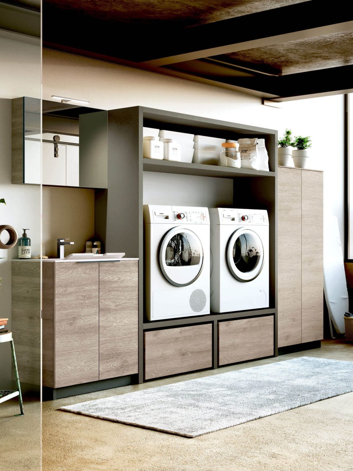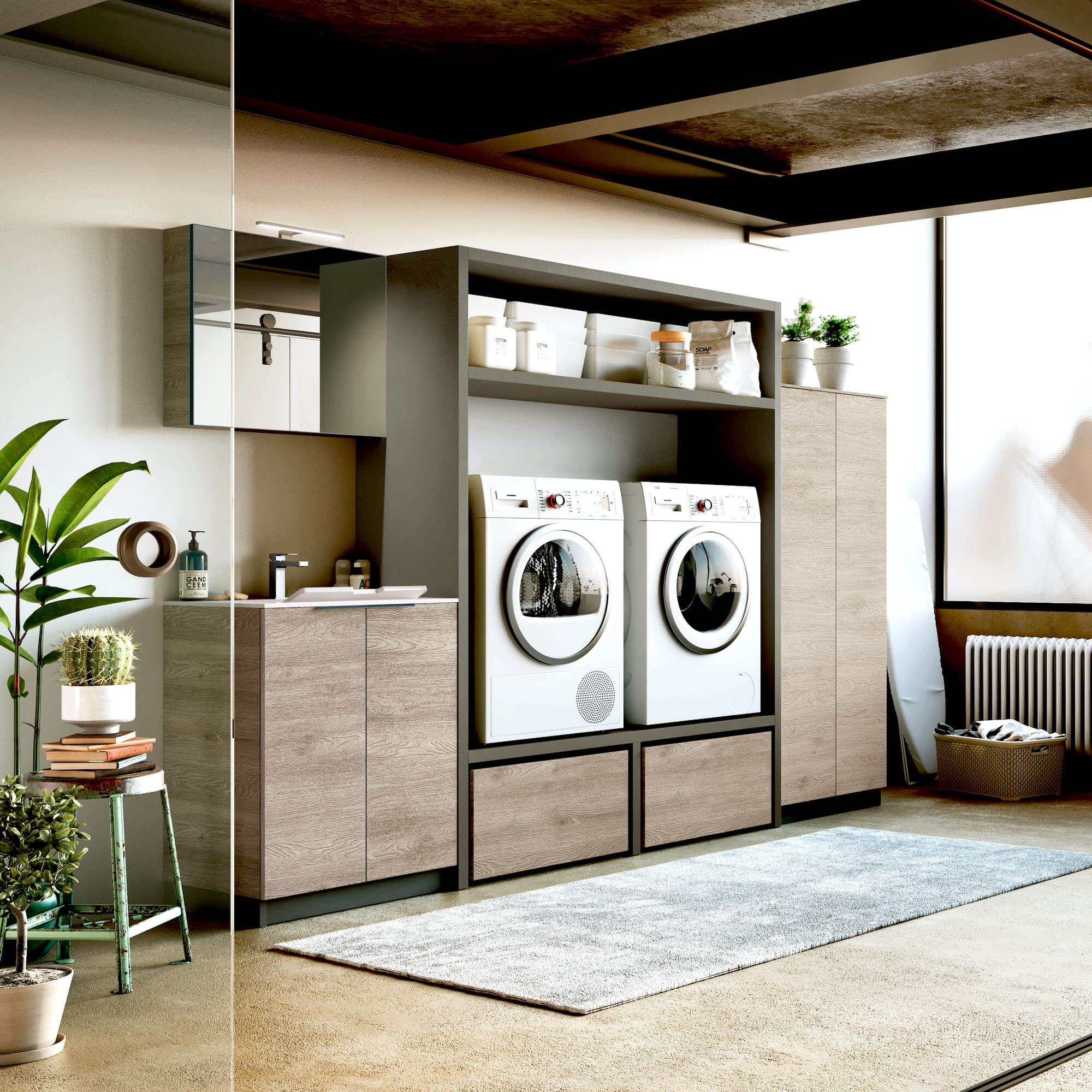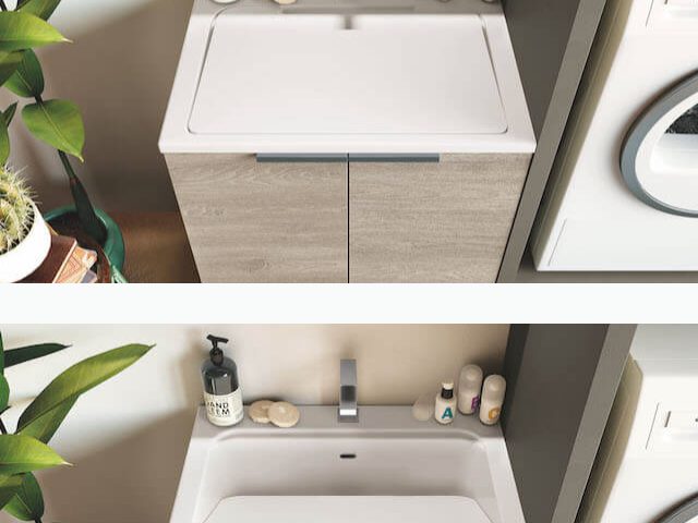 Bei diesem Vorschlag gingen wir vom Grundelement eines einfachen Waschbeckens mit passendem Sockel aus und integrierten eine funktionale Brückenlösung, die Geräte aufnehmen kann, sowie eine flankierende Säule mit einem ausgestatteten Fach.