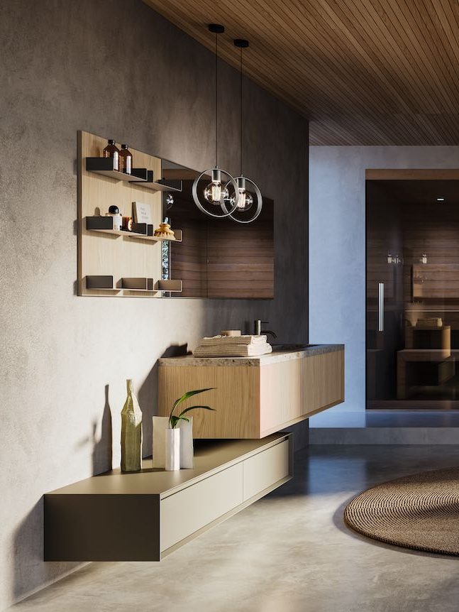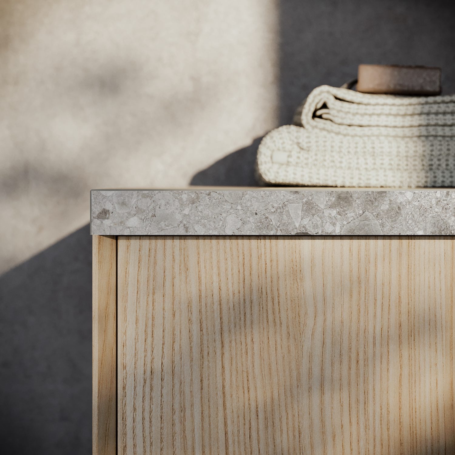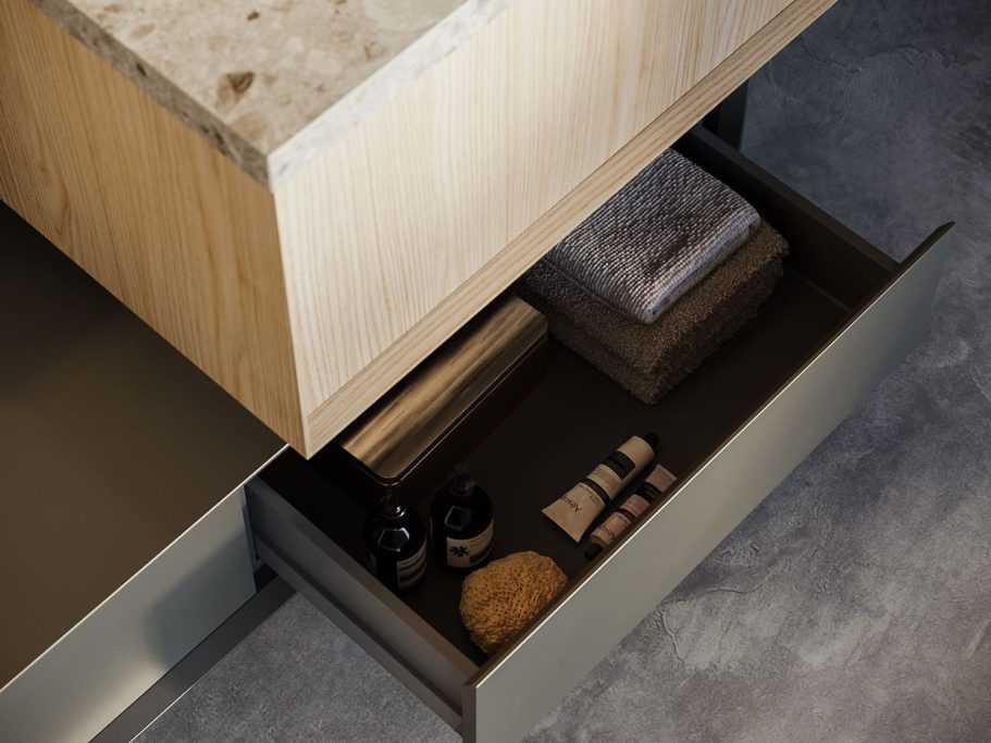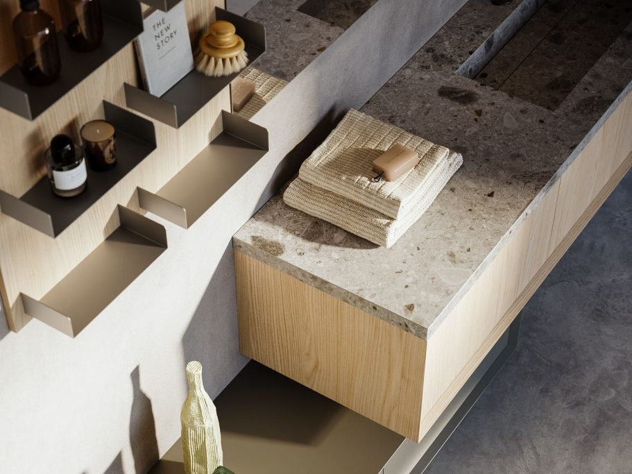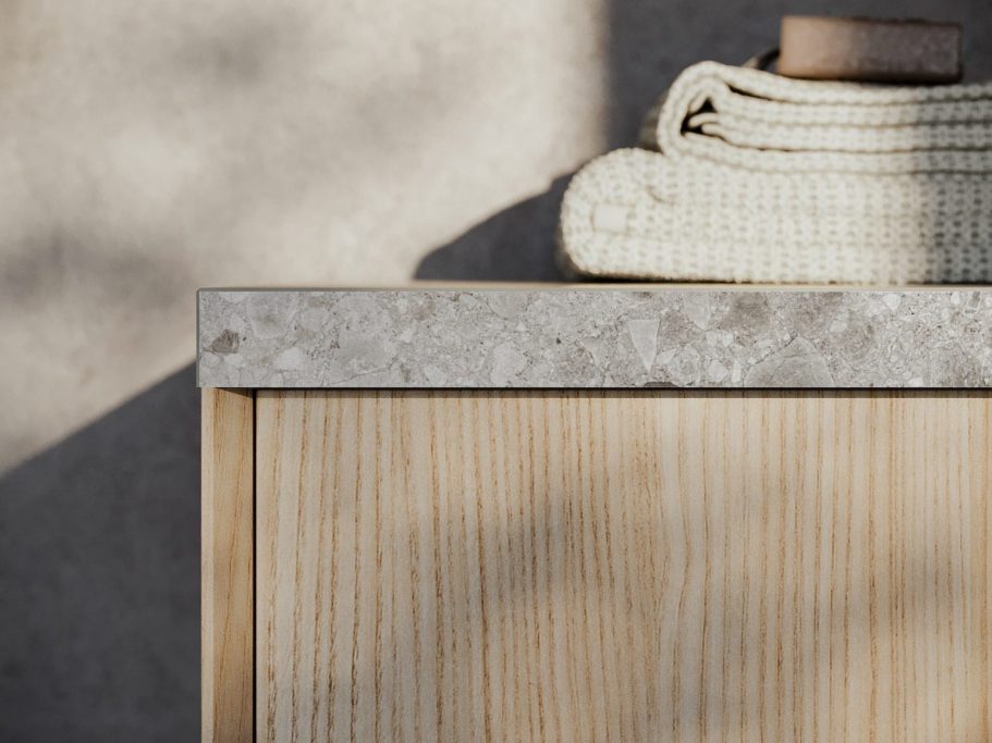Besondere Details betonen das bewusst gewählte Zusammenspiel unterschiedlicher Stärken zwischen dem Steinzeugkasten und den abgeschrägten Modula-Paneelen. Die Kombination zweier Tiefen erleichtert die alltägliche Nutzung und steigert den Komfort.