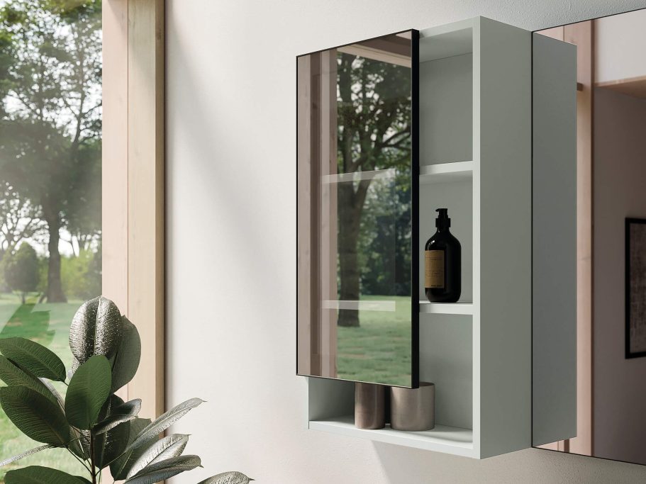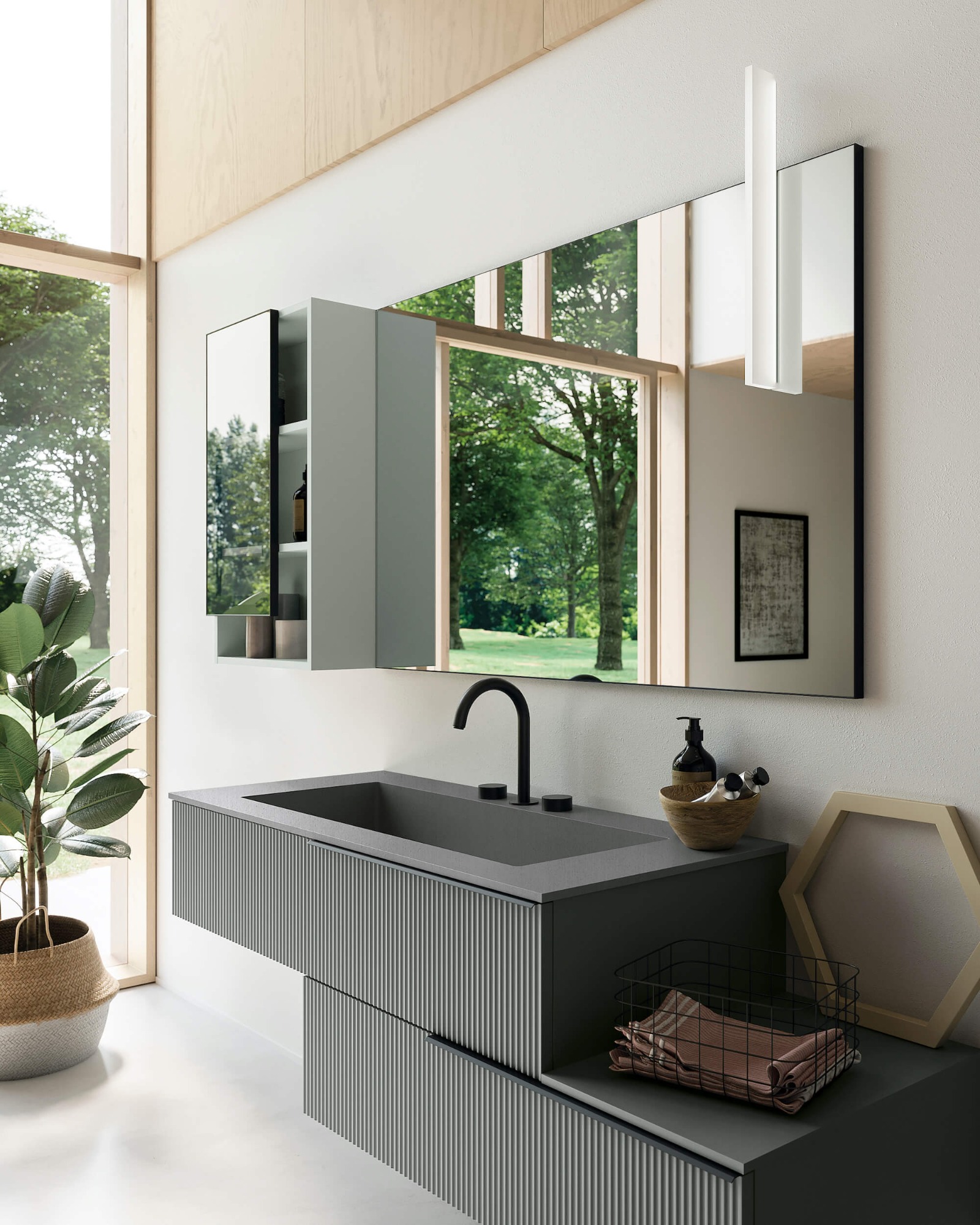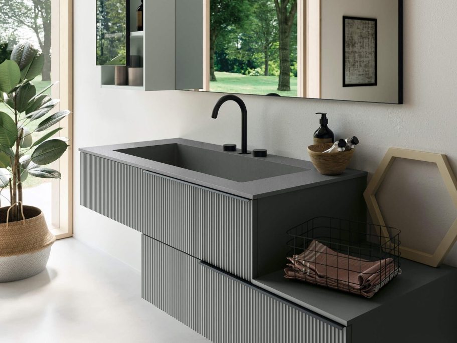 In einem Umfeld, das die geometrischen Linien der VERTIGO-Fronten optimal zur Geltung bringt, harmoniert der pudergraue Lack dieser Komposition elegant mit den Zementtönen der Deimos-Arbeitsplatte.