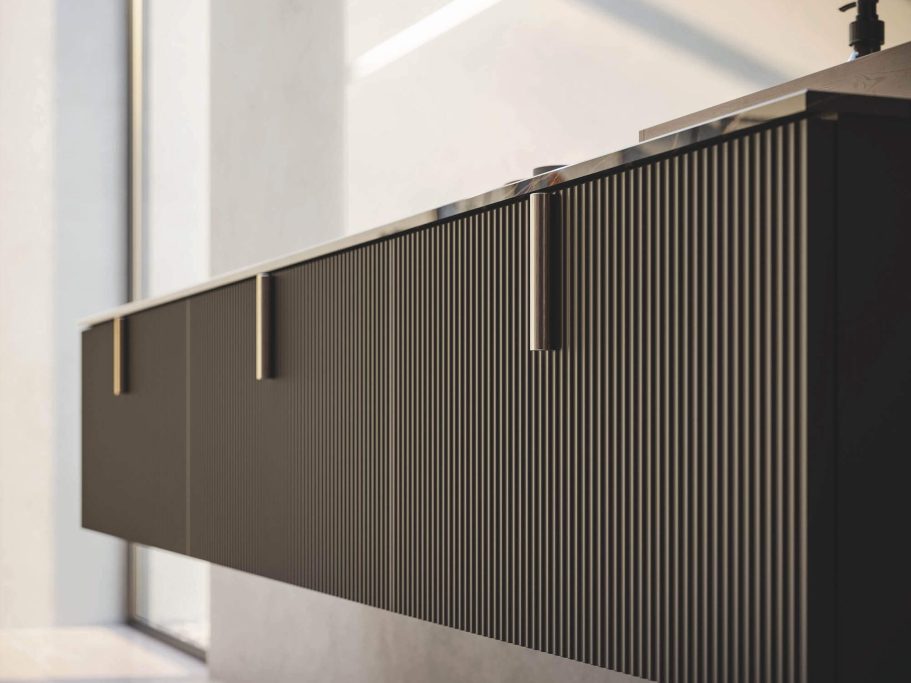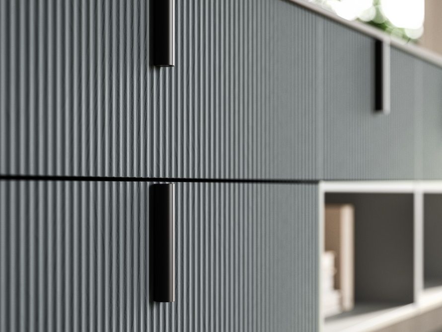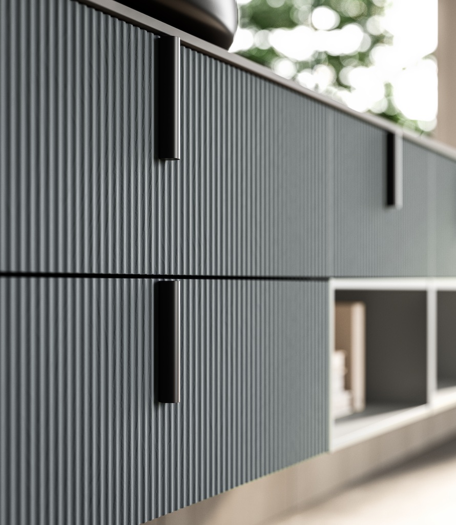 In den vorgeschlagenen Details zeigt sich, wie der Farbton der Jeans-Esche perfekt mit dem BRUMA OPACO Lack und der HPL MAILAND Decke harmoniert. Das Ergebnis ist eine Komposition von absoluter Raffinesse.