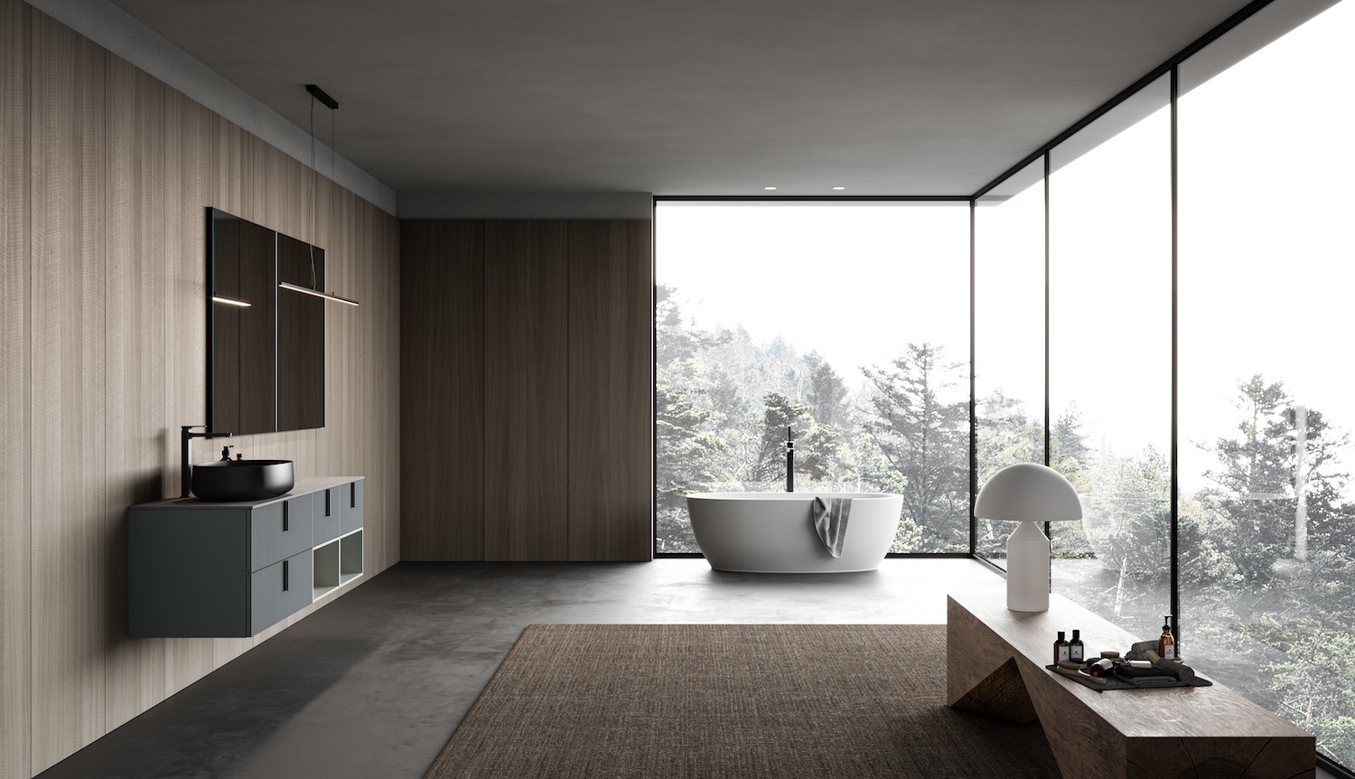 Ein Entwurf, der verdeutlicht, dass die Asymmetrie von Volumen im zeitgenössischen Design mittlerweile ein absolutes Muss ist. Die dezentral angeordneten Spiegel werden beinahe selbst zu einem architektonischen Element, verziert durch die prächtige HUNG-Lampe.